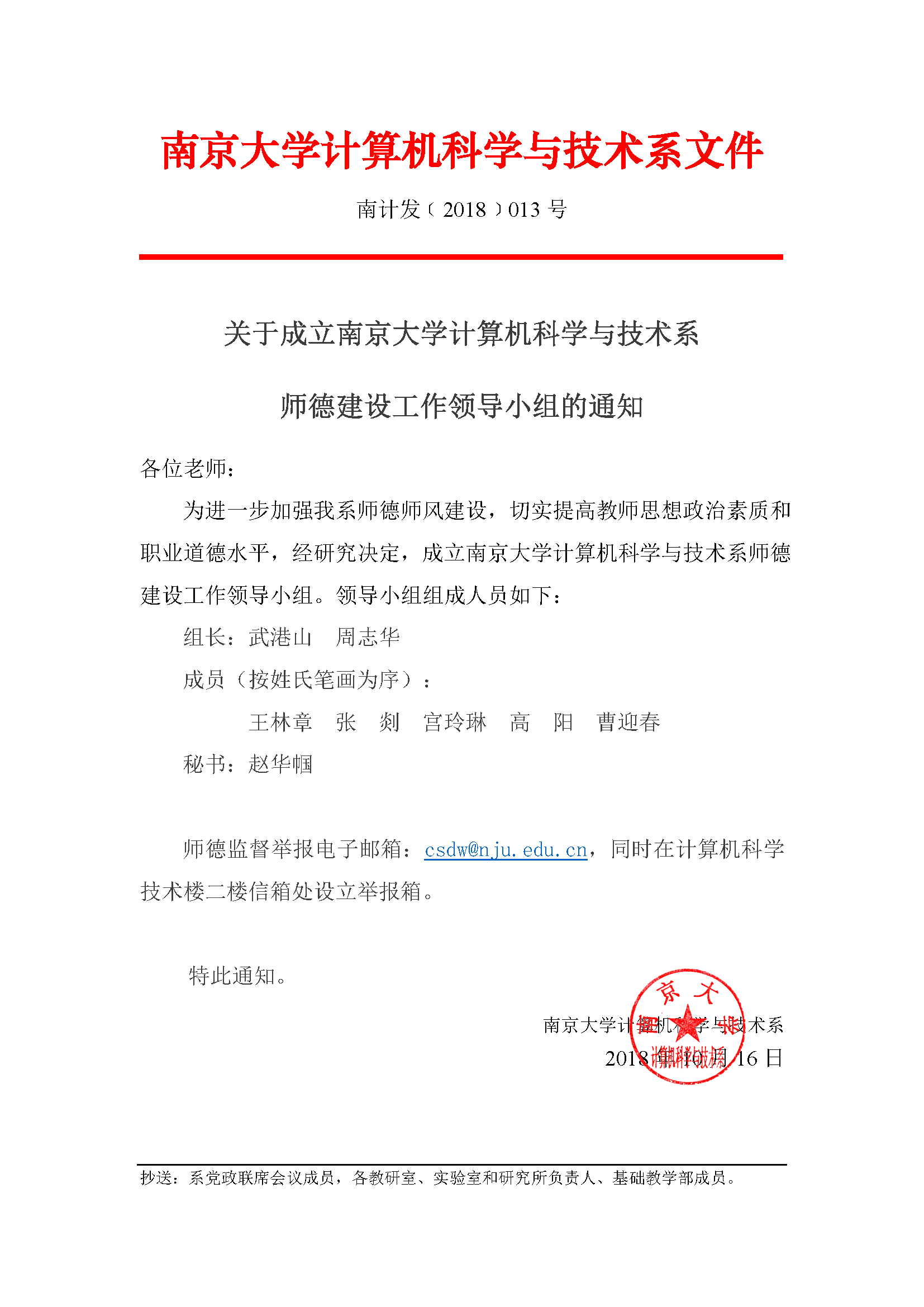 关于成立 太阳成集团计算机科学与技术系 师德建设工作领导小组的通知