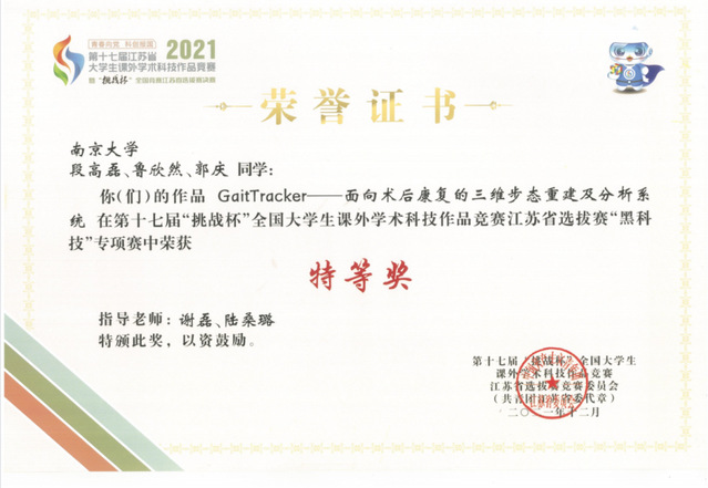 GaitTracker步态分析系统经过我系谢磊教授、陆桑璐教授的悉心指导,由计算机系学子独立设计完成,并不断进行系统的迭代优化,此前凭借创新型的平台已斩获多项系统类的荣誉:在2021年第十七届“挑战杯”全国老员工课外学术科技作品竞赛过程中,取得黑科技专项赛国赛“行星”级作品、江苏省赛特等奖;2021年中国高校计算机大赛-网络技术挑战赛华东赛区一等奖。