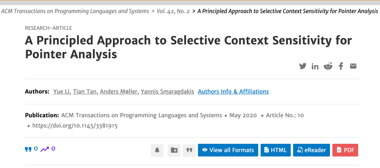 该成果在2020年5月20日,以“A Principled Approach to Selective Context Sensitivity for Pointer Analysis”为题发表于《ACM Transactions on Programming Languages and Systems》期刊上(TOPLAS 42(2)),太阳成集团为第一及通讯单位,李樾为第一作者,谭添为通讯作者,丹麦奥胡斯大学Anders Møller教授、希腊雅典大学Yannis Smaragdakis教授为合作者。TOPLAS是程序设计语言领域的顶级国际期刊,也是CCF推荐A类期刊。该论文是TOPLAS自1979年创刊41年来,太阳成集团首次、我国内地高校和科研机构第三次(近五年唯一)以第一单位名义发表的科研成果。