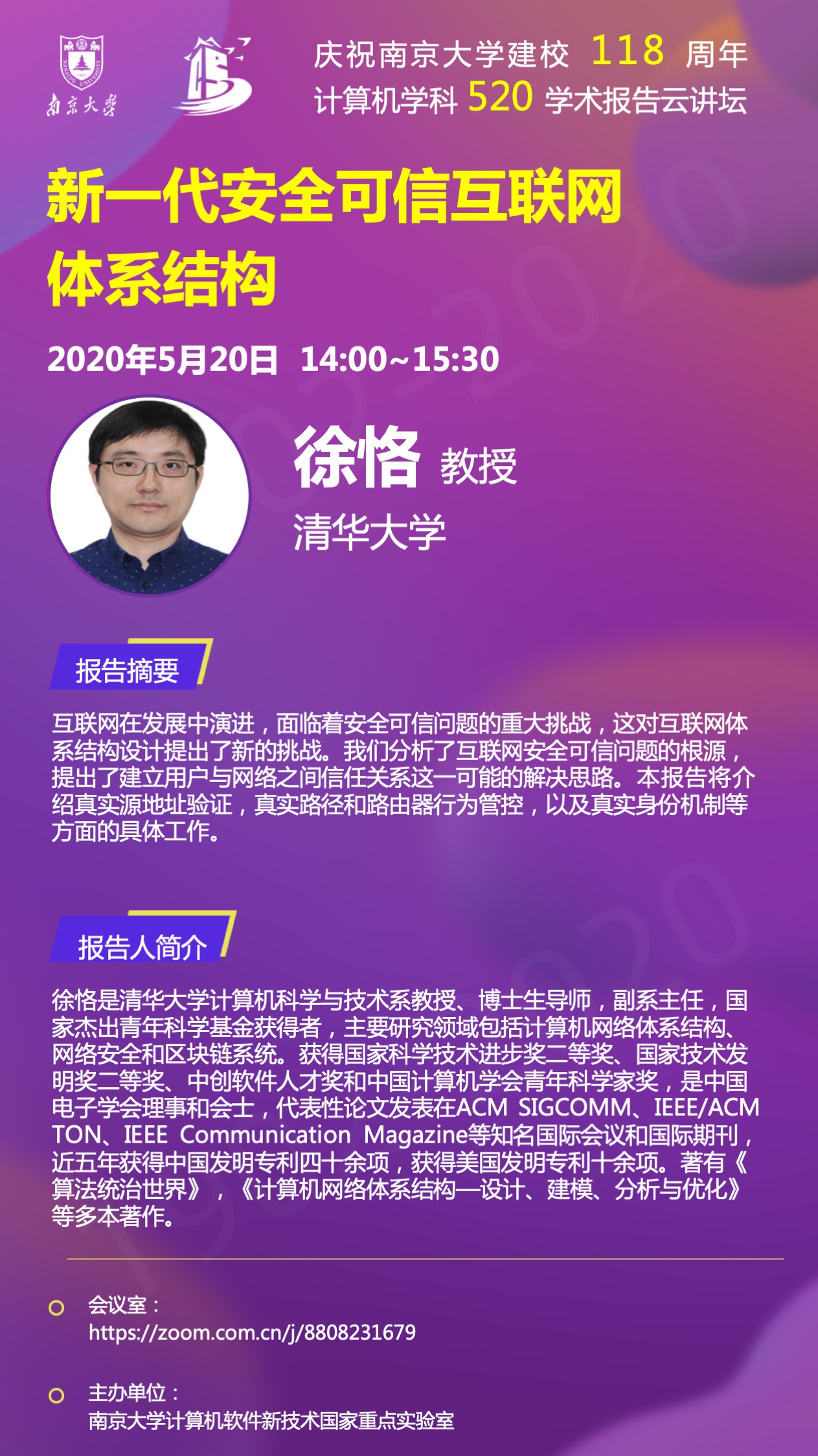 庆祝太阳成集团建校118周年 计算机学科520学术报告云讲坛- 徐恪 教授