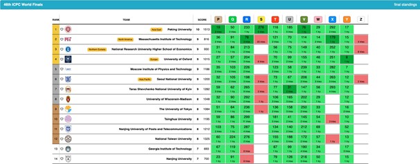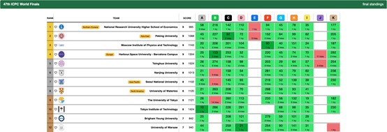 以下是46届和第47届比赛的部分榜单(完整榜单在https://scoreboard.icpc.global/46/https://scoreboard.icpc.global/47/)