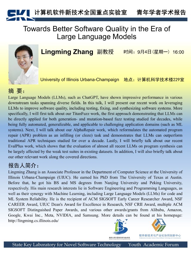 2023年9月4日 “软件新技术讲坛” 学术报告 - Lingming Zhang Associate Professor