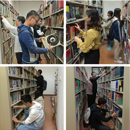 阅览室进门处附近的书架,书籍比较新,时常有师生借阅,图书摆放错位的情况相对常见;后排书架上的书籍则有一定年代,闲置的时间较长,大多积攒了厚厚的灰尘,部分号码模糊不清。因而,清点图书、找出排列有误的书籍并不像想象中的那么轻松,党员志愿者们不仅要熟悉书架的位置、书籍的排列规则,还要能及时发现序列号排列错误的书籍,并将其迅速归位。起初,部分党员同学对书籍的编号规则和排列方式有些生疏,在冯老师的耐心指点下,很快掌握了诀窍。各小组成员分工合作,清点、分类、倒架、上书、整架,动作干净麻利。整理完一列书架,很多同志的手上已经沾满了灰尘,更换书架时,爱惜书本的党员同志们不怕麻烦地清理,尽可能保证图书的干净、整洁,不让灰尘沾染到图书上。其中,清点、检查书架最下层图书时最不容易,清点的党员同学需要在一段时间内保持蹲姿逐一查看、整理,但是党员同学们没有偷懒,书架前常能看到同学们蹲在地上,目光炯炯,手指指着书籍的序列号标识,一本一本地对照查验。