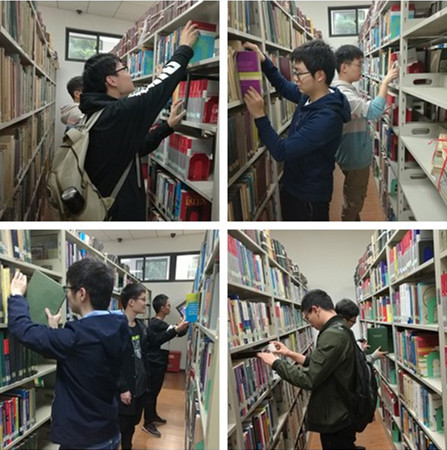 16:00,党员同志们来到位于计算机科学技术楼大厅东南方位的计算机系图书阅览室,在负责图书阅览室工作的冯珍竹老师带领下,首先熟悉阅览室环境、了解图书整理相关要求。冯老师简要介绍了书籍的编号规则和排列方式,并指导党员同志以3-4人为小组,按照书本上标识的图书序列号,逐一清点、检查书架上的书籍,找出未按顺序排列的书籍,将其摆放至正确的位置,以便于老师同学们后期查找、借阅。