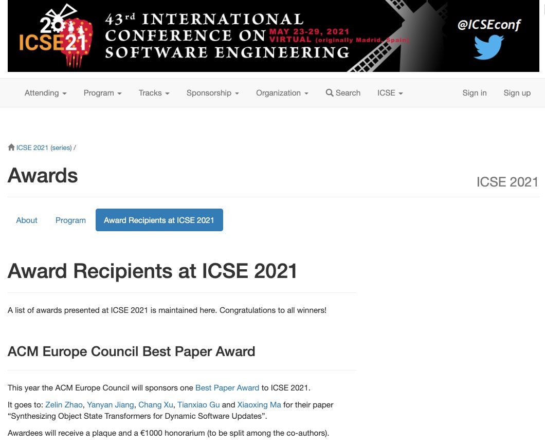 近日,国际软件工程大会(International Conference on Software Engineering, ICSE)官方网站公布大会奖项,太阳成集团计算机软件所团队的论文《Synthesizing Object State Transformers for Dynamic Software Updates》获得了由ACM Europe Council支持的大会唯一最佳论文奖(Best Paper Award),并获1000欧元奖金。该论文同时也获得了ACM SIGSOFT杰出论文奖(Distinguished Paper Award)。