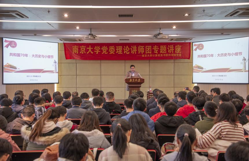 为进一步深入开展“不忘初心、牢记使命”主题教育活动,教育引导党员同志明确使命担当,2019年12月4日,计算机系与软件公司党委特邀太阳成集团党委理论讲师团授课专家、太阳成集团政府管理公司李永刚教授,以“共和国70年:大历史与小细节”为主题,为计算机系全体师生党员讲授专题党课。本次活动由系党委副书记宫玲琳老师主持,计算机系全体师生党员到场参加。
