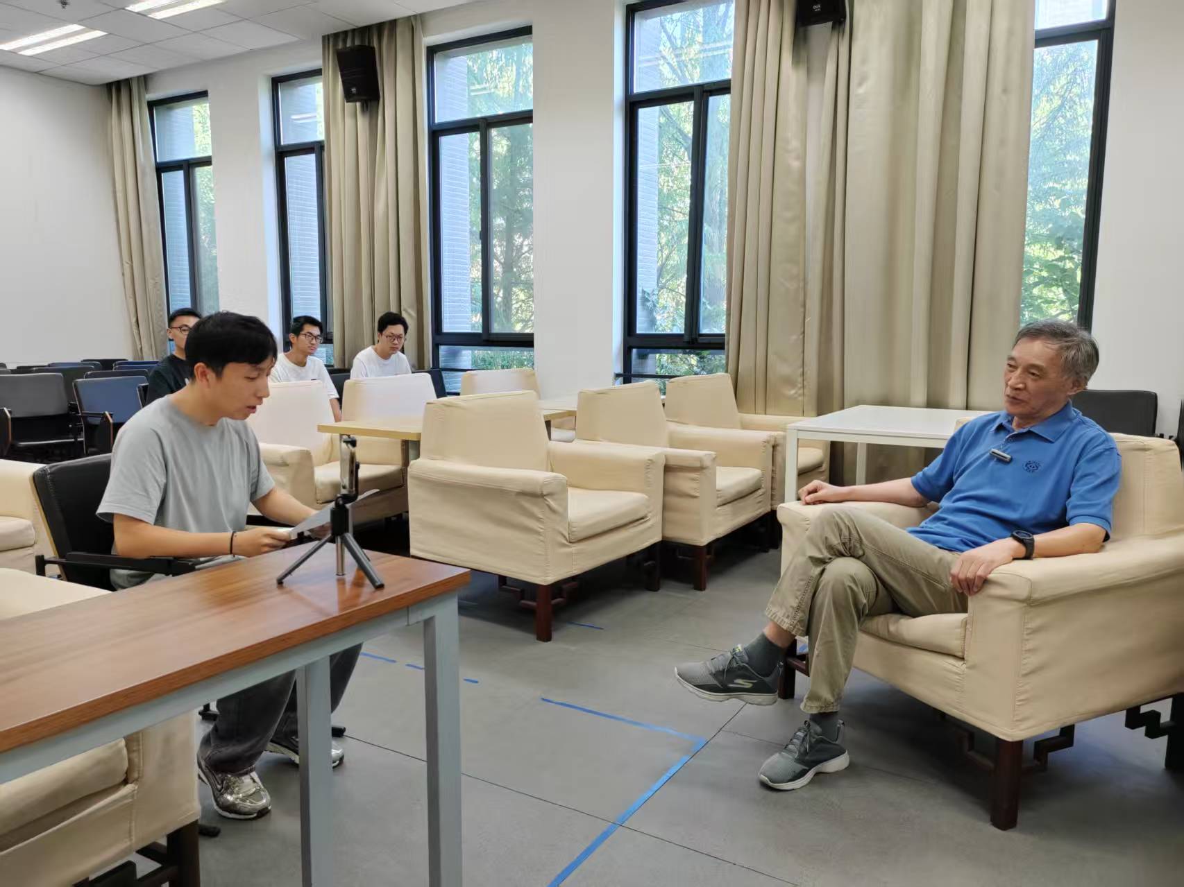 八月中旬,立秋虽过,暑气未消,天地间仍蒸腾着盛夏的余威。上午九时半,陈道蓄教授冒着酷署从住居的龙江小区专程乘坐一小时的地铁赶到仙林校区计算机楼219会议室接受釆访。访谈由公司2021级本科生刘博石主持,2023级本科生林雨昕协助拍摄,公司关工委副主任潘金贵教授以及在职青年教师过洁副教授和六名暑假在实验室加班的研究生全程参加了眝听学习。