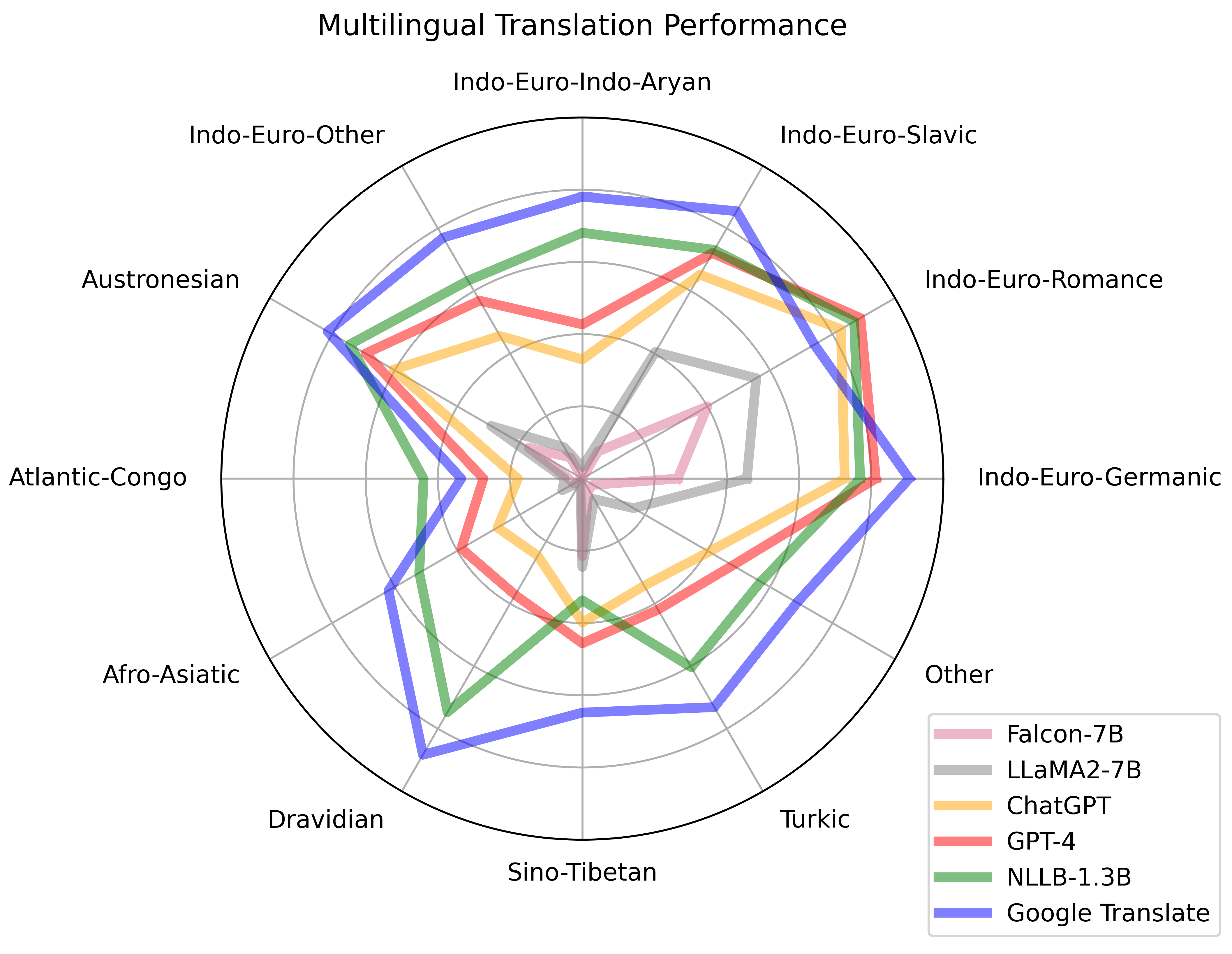 该方面工作系统地评测了包括ChatGPT在内的一系列大语言模型在102种语言,202个以英文为核心的翻译方向上的多语言机器翻译能力,探究了使用大语言模型进行多语言机器翻译的优势与挑战。研究发现:即使是最强的大语言模型(ChatGPT),仍然在83.33%的翻译方向上落后于强大的有监督基线模型(NLLB)。经过进一步的分析实验,我们发现在机器翻译任务上,大语言模型展现出了一些新的工作模式。为后续大语言模型和机器翻译、多语言相关研究探索了方向。该工作两年内Google scholar被引293次。该研究还探索了基于多语言指令学习激发大语言模型翻译能力的可行性,并在能力激发的原理和泛化性等方面进行了探索。