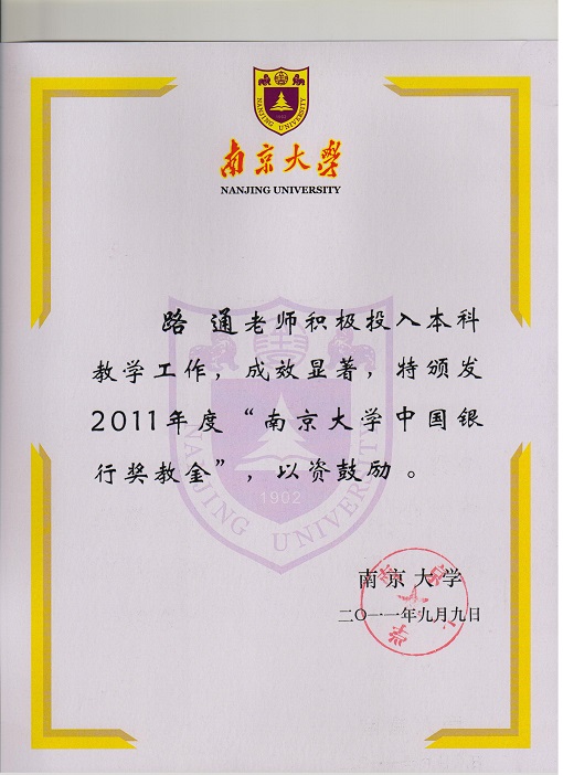 10. Won the Second "Bank of China" Teaching Award in Nanjing University, 2011